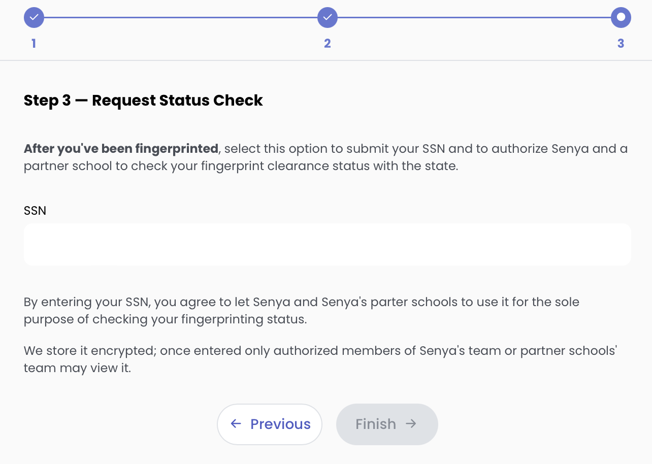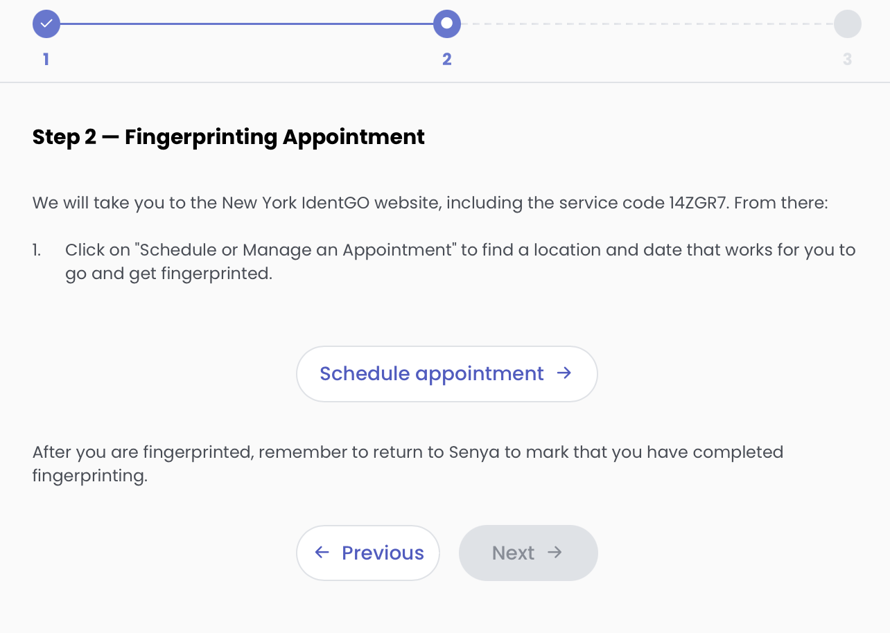 After your fingerprinting appointment is complete, go back to the Senya app and go to Step 3 to have Senya review your clearance.